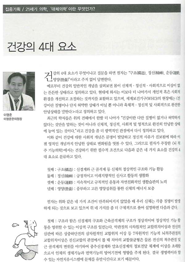 건강의 4대 요소가 무엇이냐고 질문을 하면 필자는 “구조(構造), 정신(精神), 운동(運動, 영양(營養)”이라고 주저 없이 답변한다.