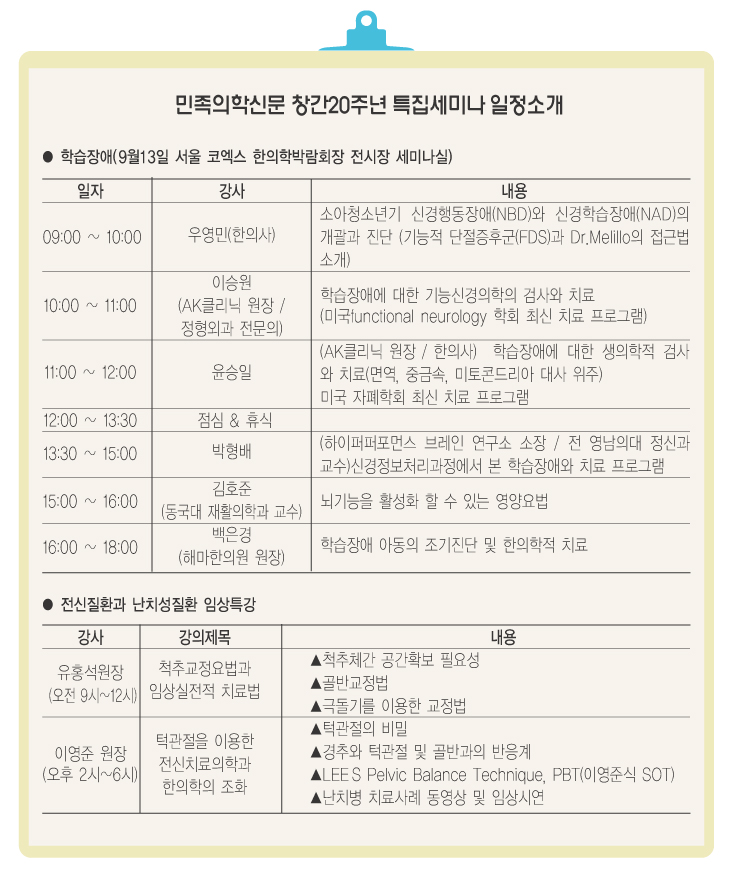 민족의학신문(회장 임철홍)이 창간 20주년을 맞아 오는 13일 ‘제11회 한의학국제박람회’가 열리는 서울 코엑스 B홀에서 ▲학습장애 ▲FCST(기능적 뇌척추요법) ▲신개념 척추교정요법 등 전문세미나를 개최한다.
